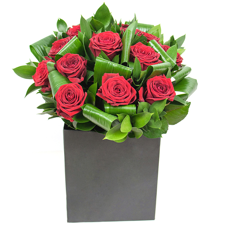 Enhance your home with our stunning bouquet, featuring vivid red roses, elegant aspidistra leaves, and lush ruscus. This unique design exudes both style and sophistication.