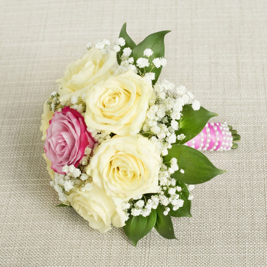 Step into a realm of beauty with our captivating bridesmaid bouquet. This exquisite arrangement combines vibrant pinkish-purple roses and sophisticated white creamy roses, accentuated by the charming Gypsophila and fresh Aralia leaves. Meticulously hand-selected, each bloom is chosen for its exceptional quality and lively freshness, ensuring a bouquet that radiates elegance and luxury.